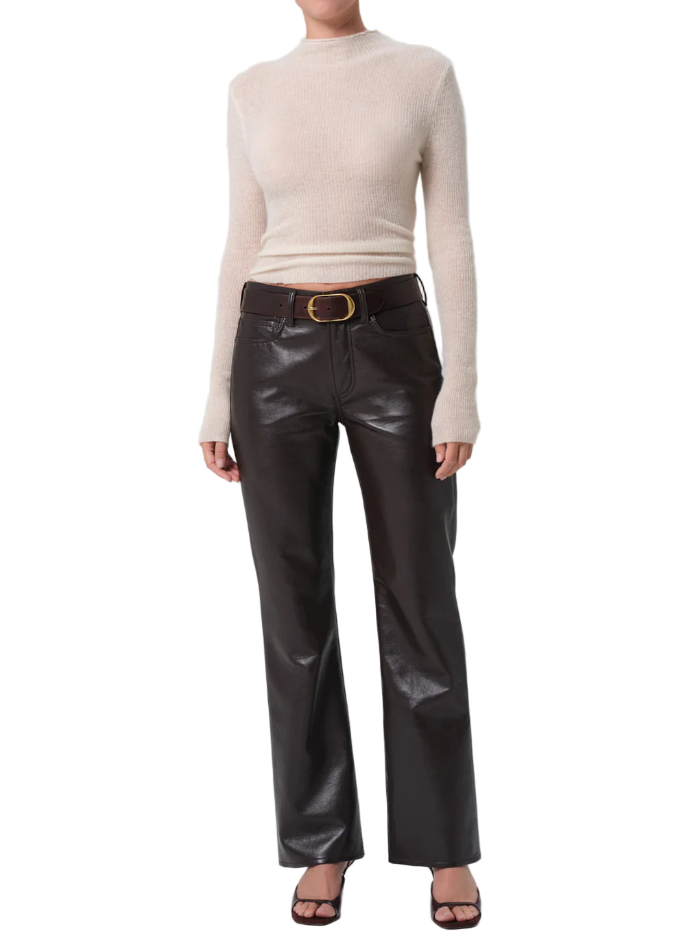 • The silhouette fits true to size and falls to a full-length bootcut, offering a luxe, modern take on leather pants