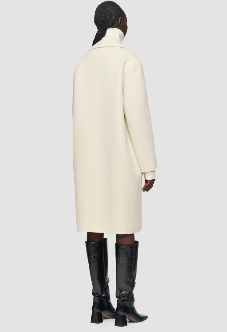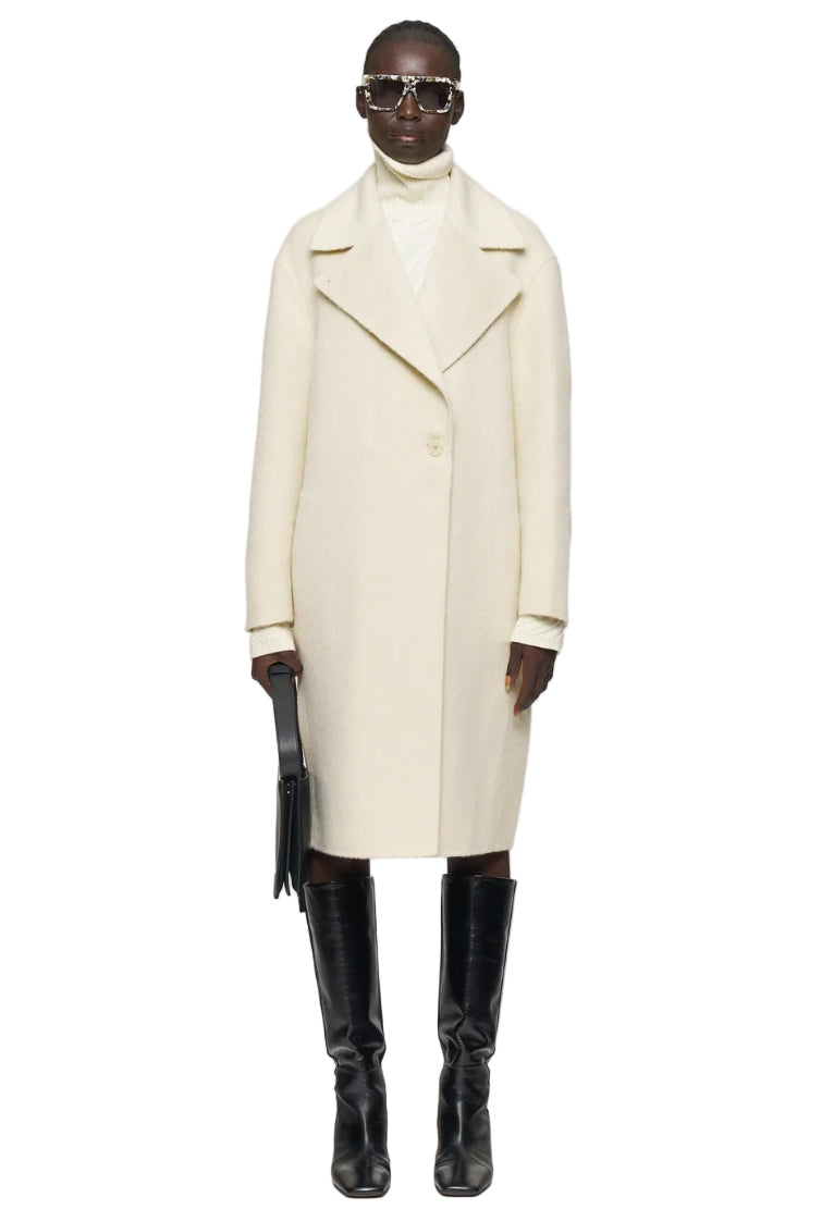 • It has a cocoon-like silhouette and is finished with wide lapels which can be worn open or buttoned at the collar