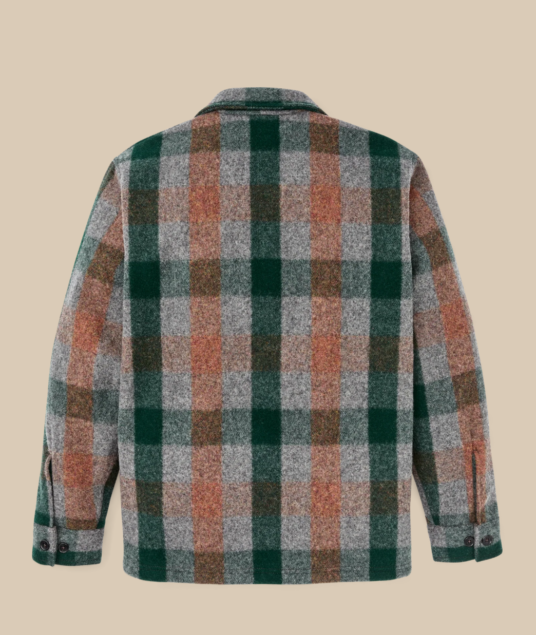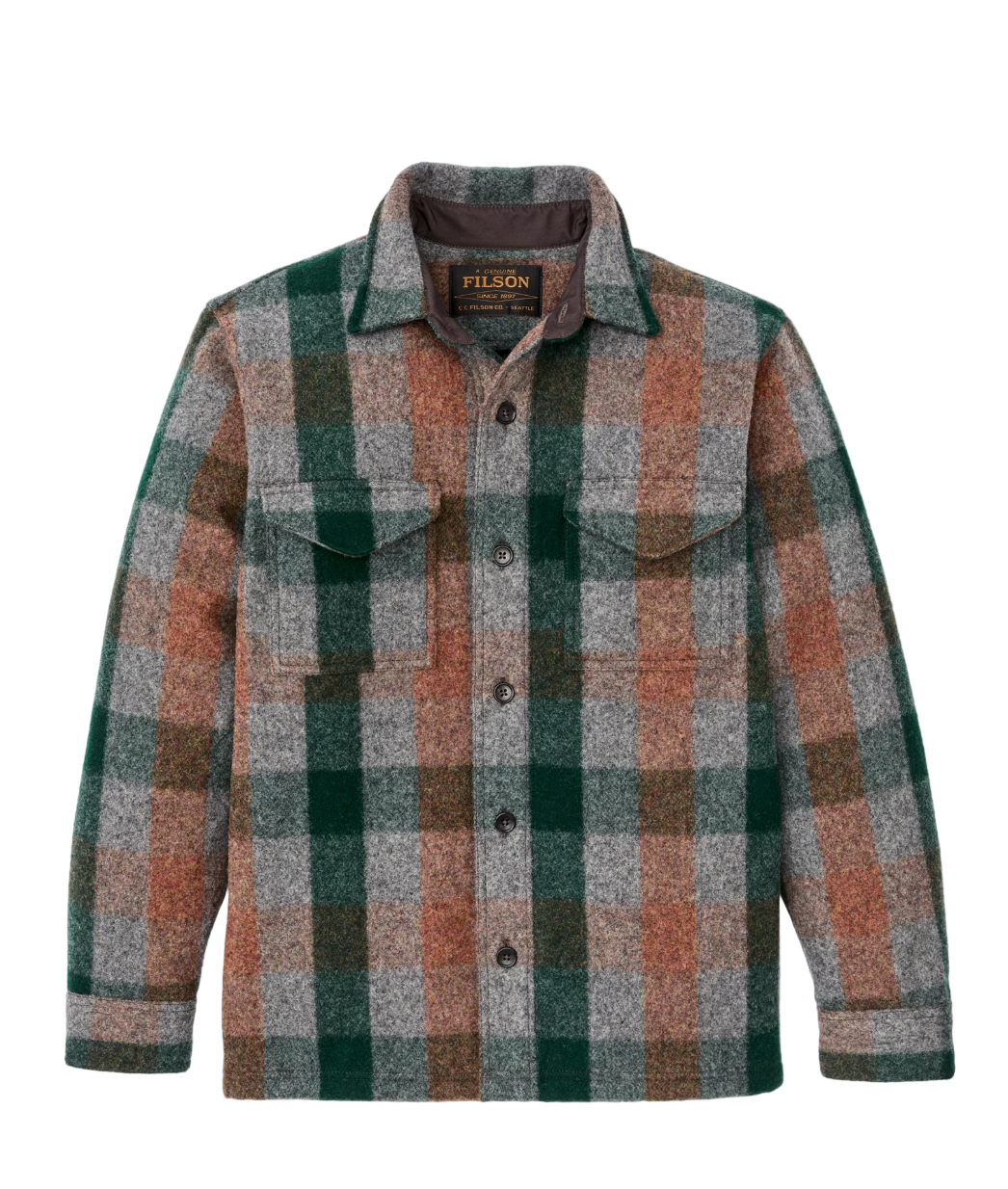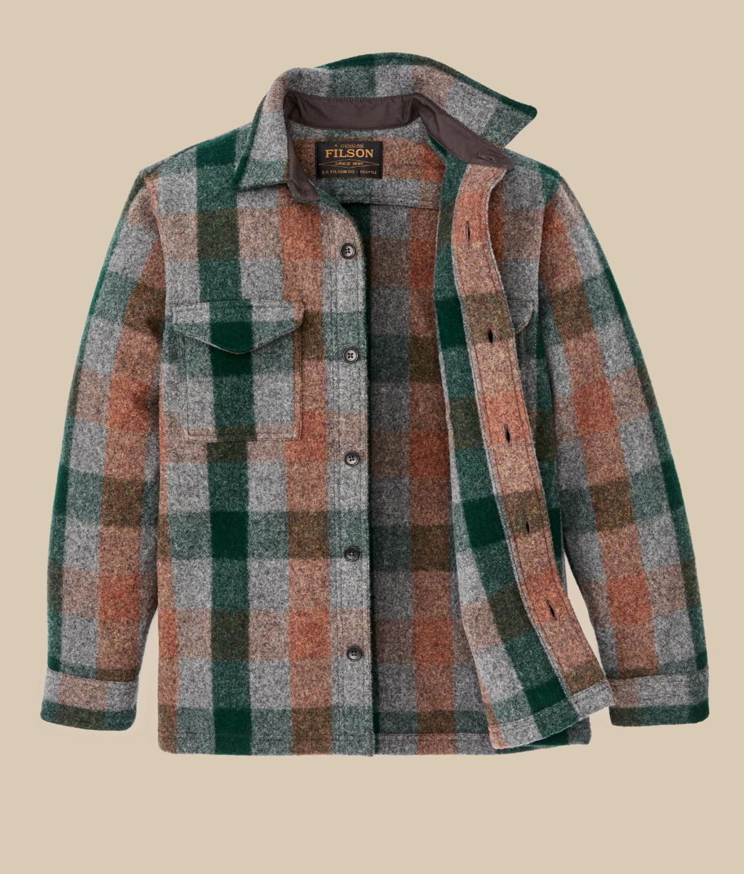 Filson Mackinaw Wool Shirt Jacket in Green/Orange/Gray Plaid