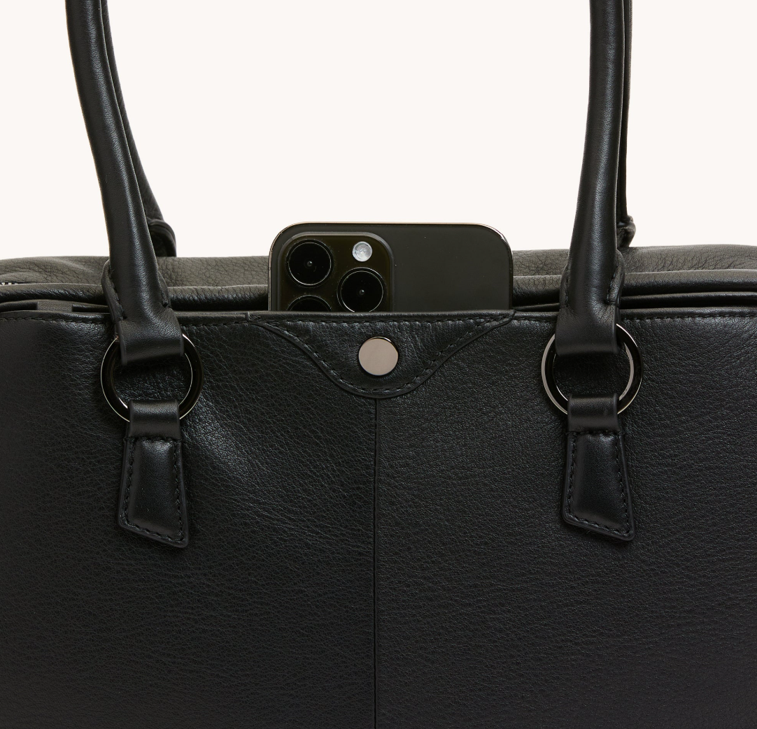 - Crafted with a classic black pebble leather