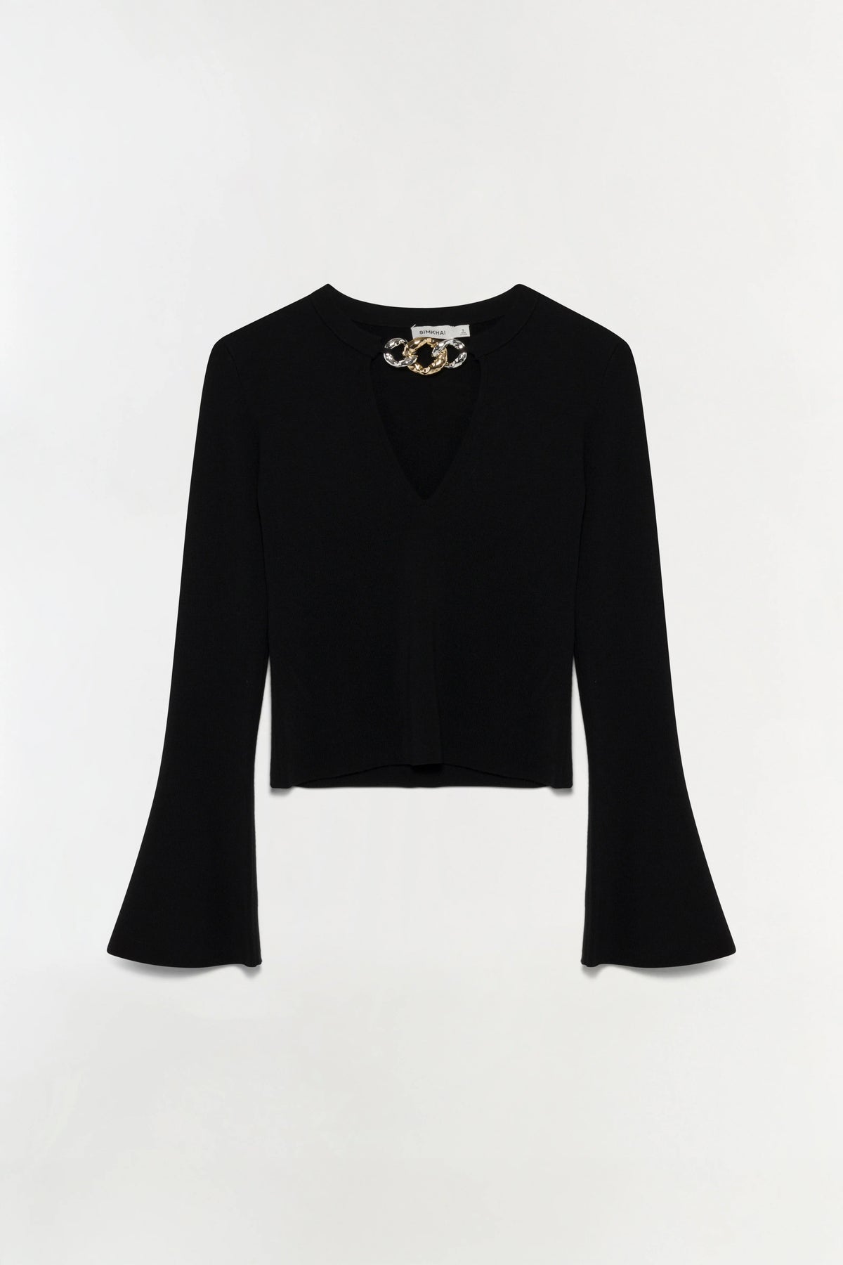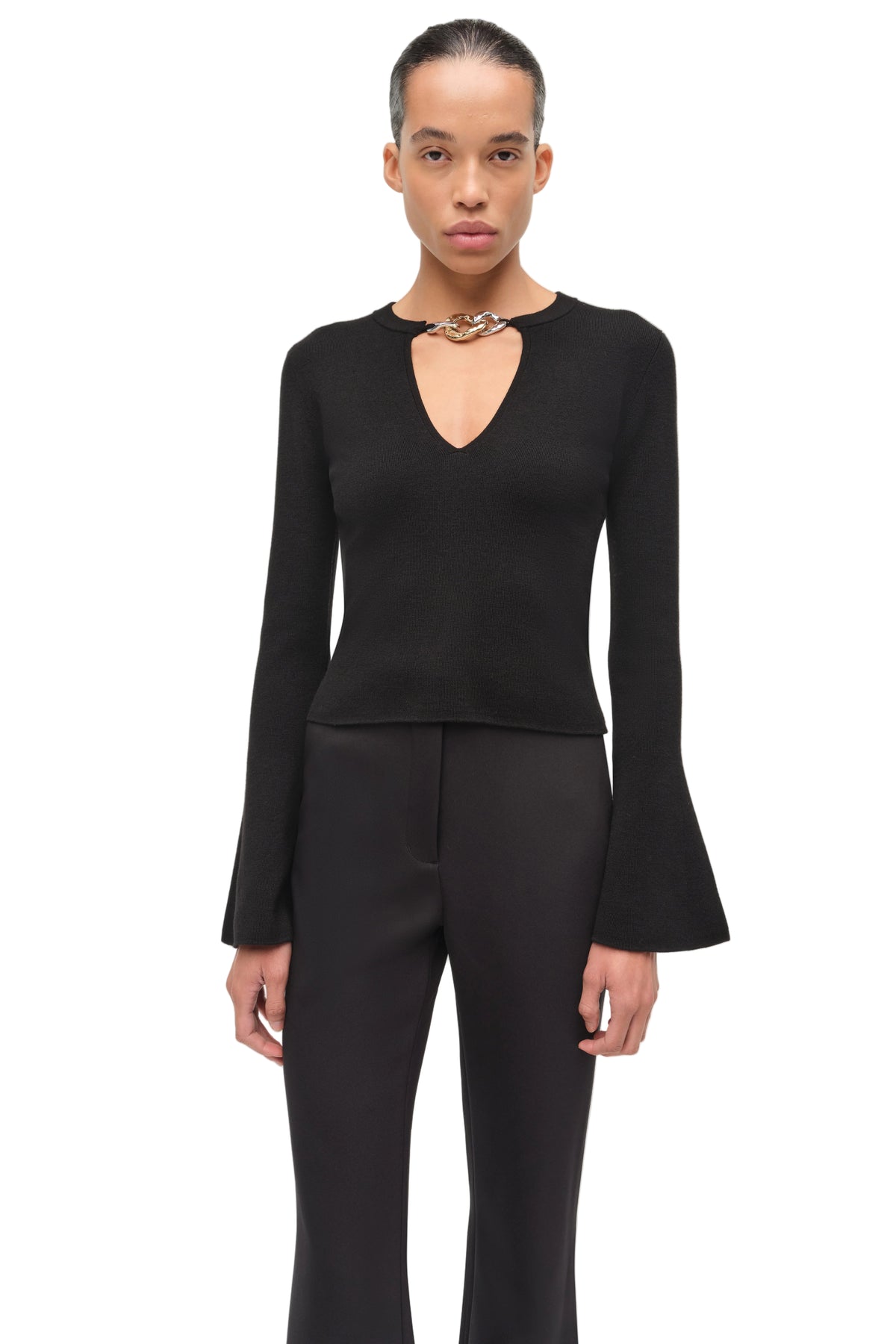 • Crafted in lightweight merino wool, this knit features a keyhole neckline anchored by a sculptural chain link
