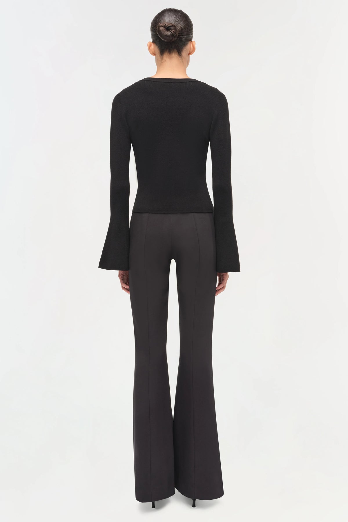 • The long sleeves flare gently at the cuff, shaping a clean, elongating line