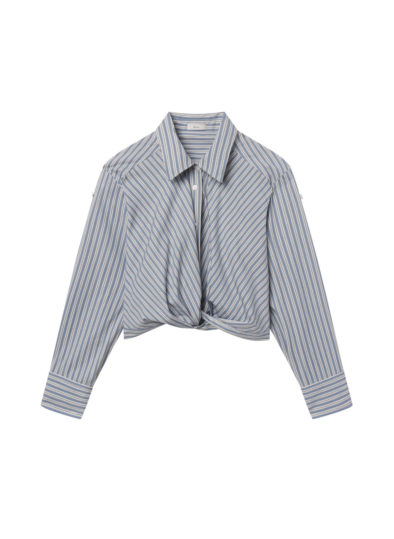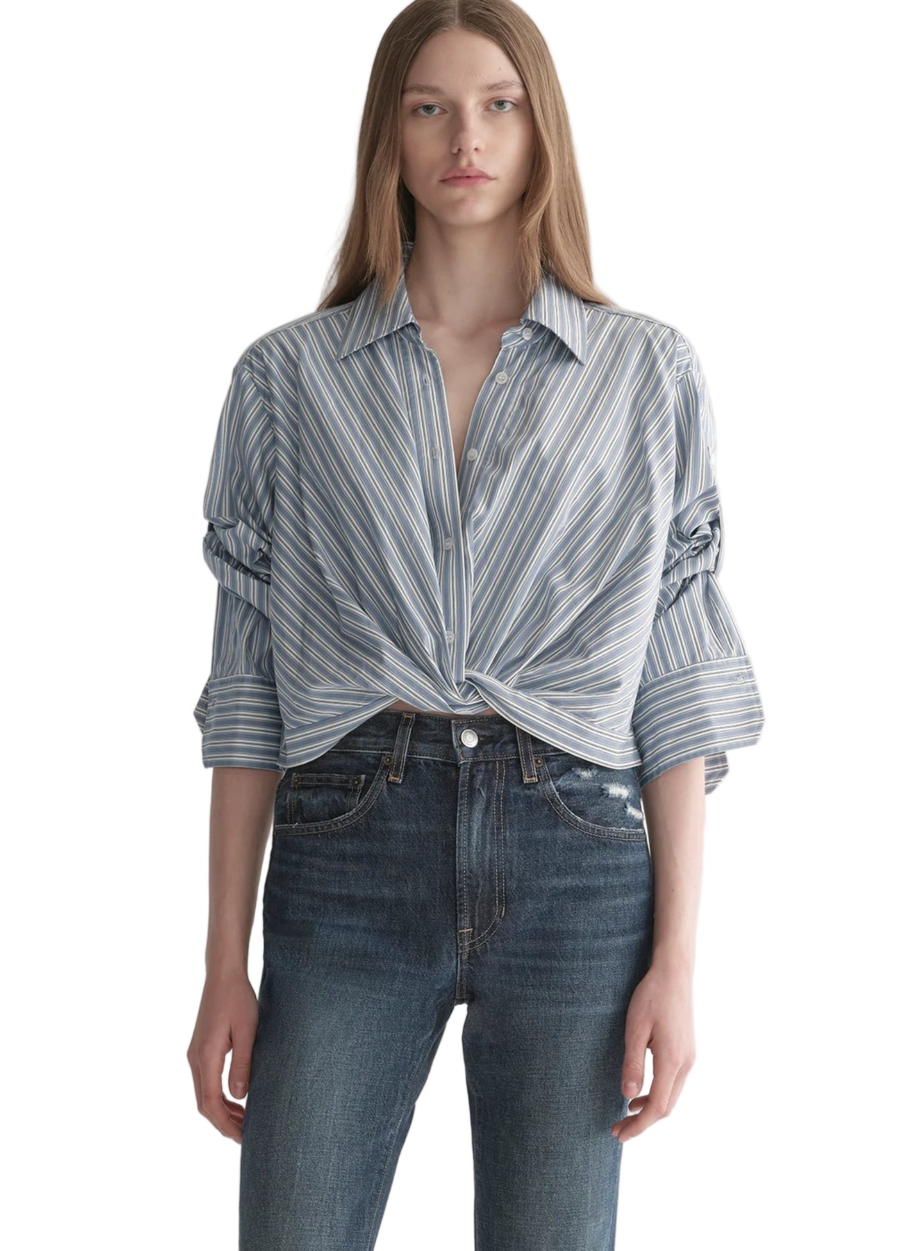 • The Leo Top is crafted from crisp 100% cotton in a vertical shirting stripe of white and steel blue