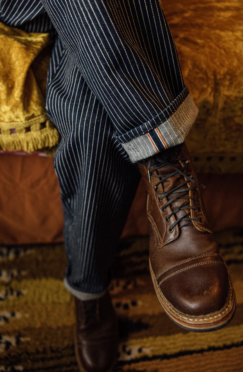 - Japanese 14oz Stripe Selvedge, zipper fly, and custom-branded hardware