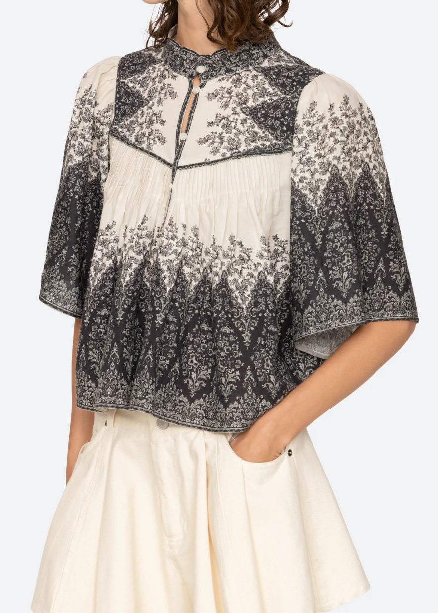 • The Hedra floral print top features a floral print motif, a high neckline, and short flowy sleeves