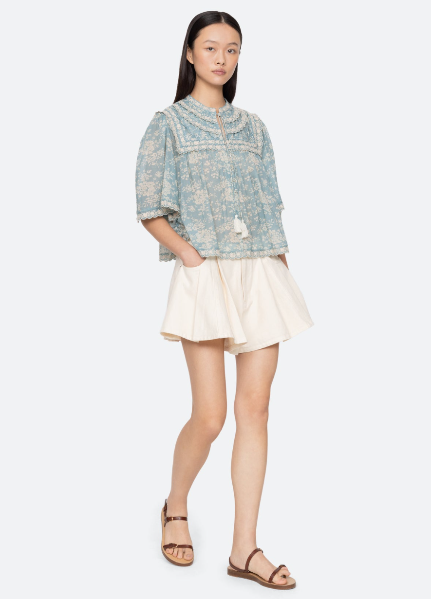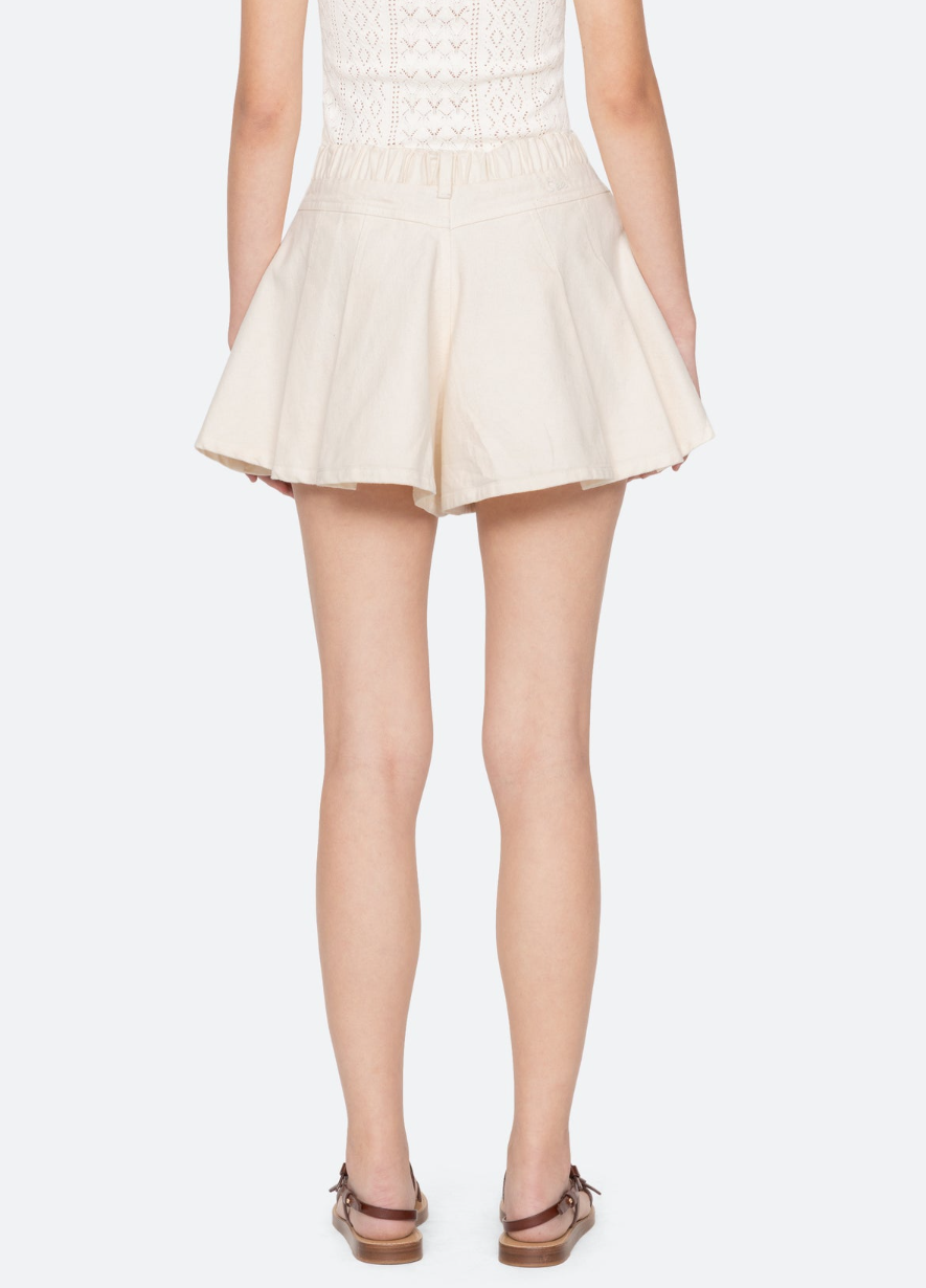 • The Stasia denim shorts feature a mini silhouette with an elasticized waistband, designed with large pleats that create a softly flared shape