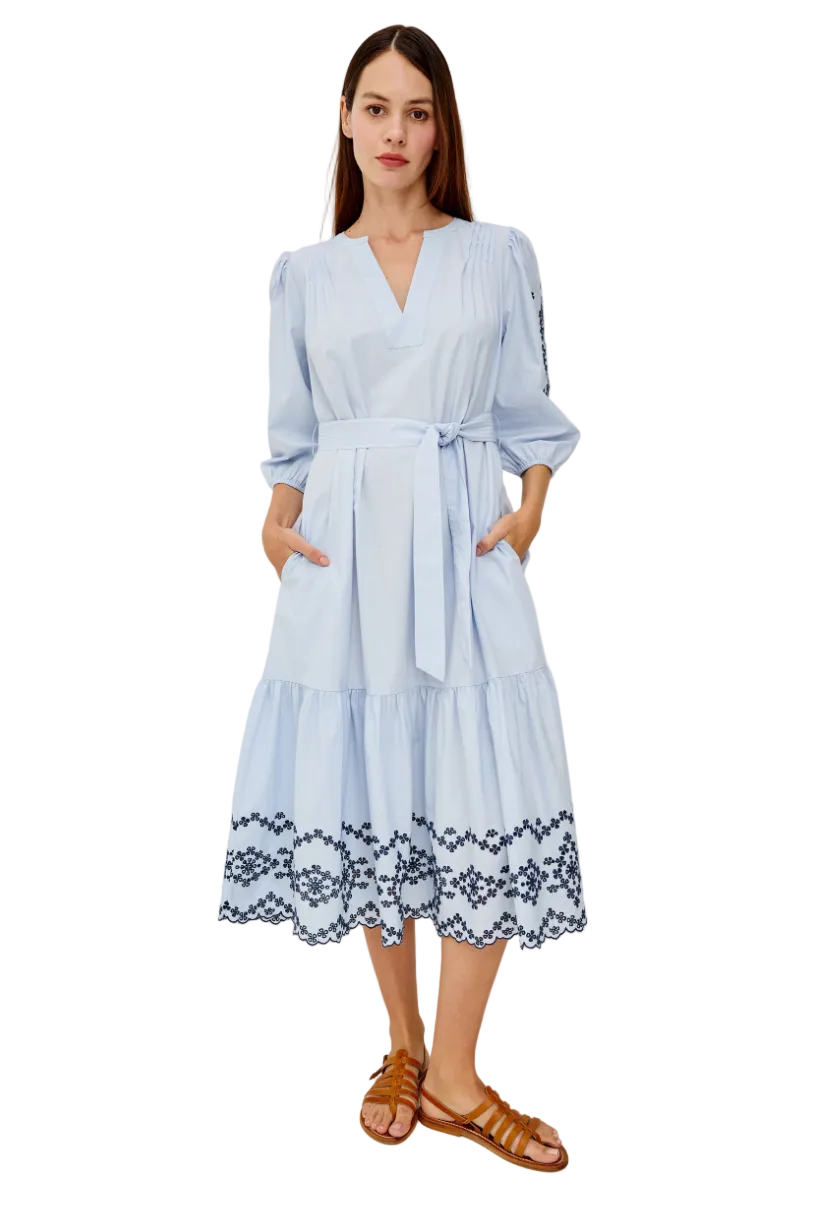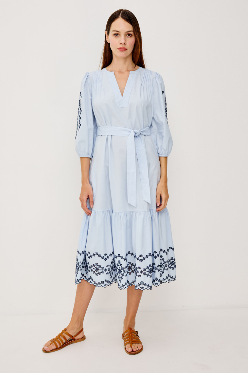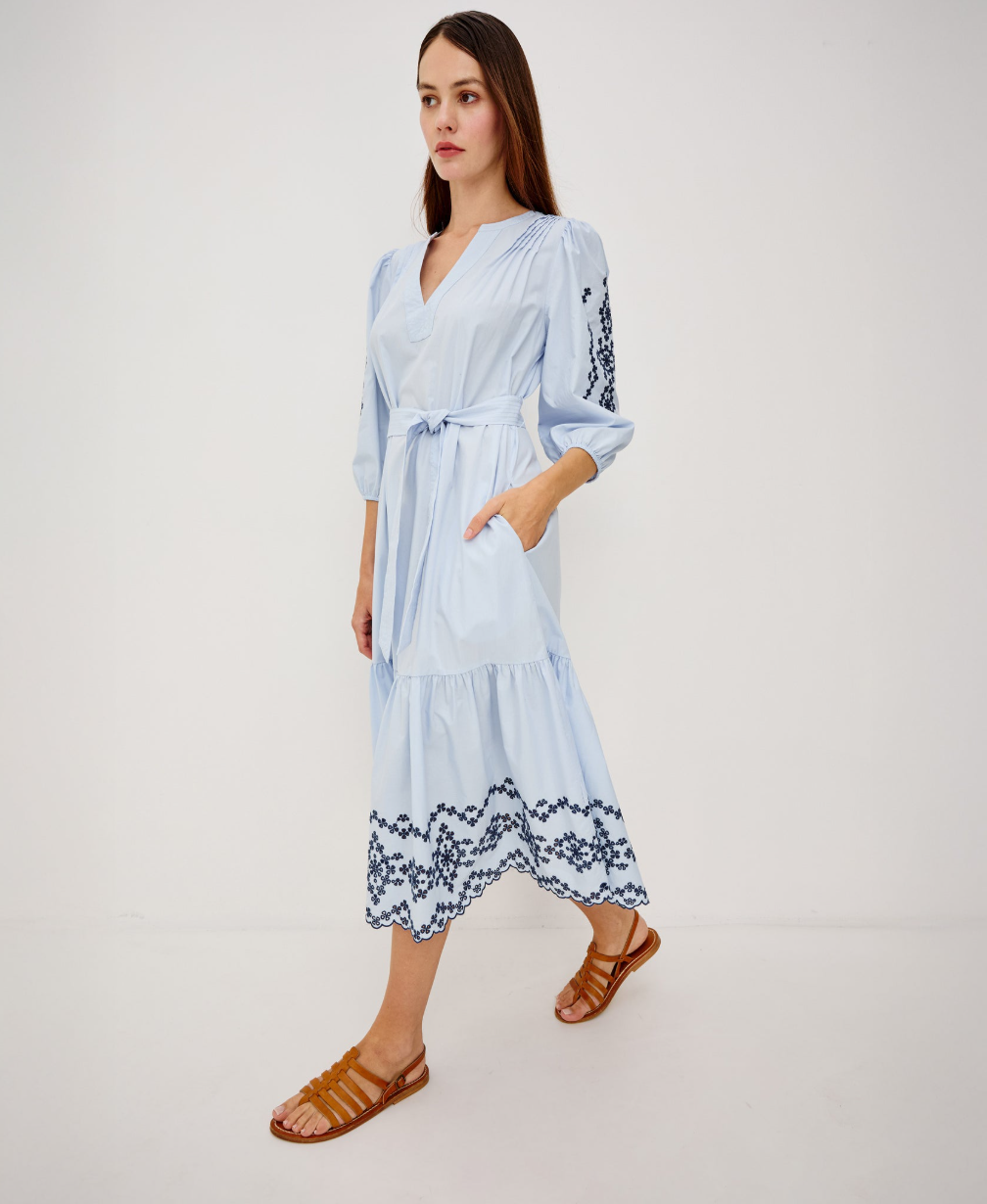 • Cut in a peasant-style maxi silhouette with pleated shoulders, a V-neckline, three-quarter puff sleeves, adjustable waist ties, and a tiered seam