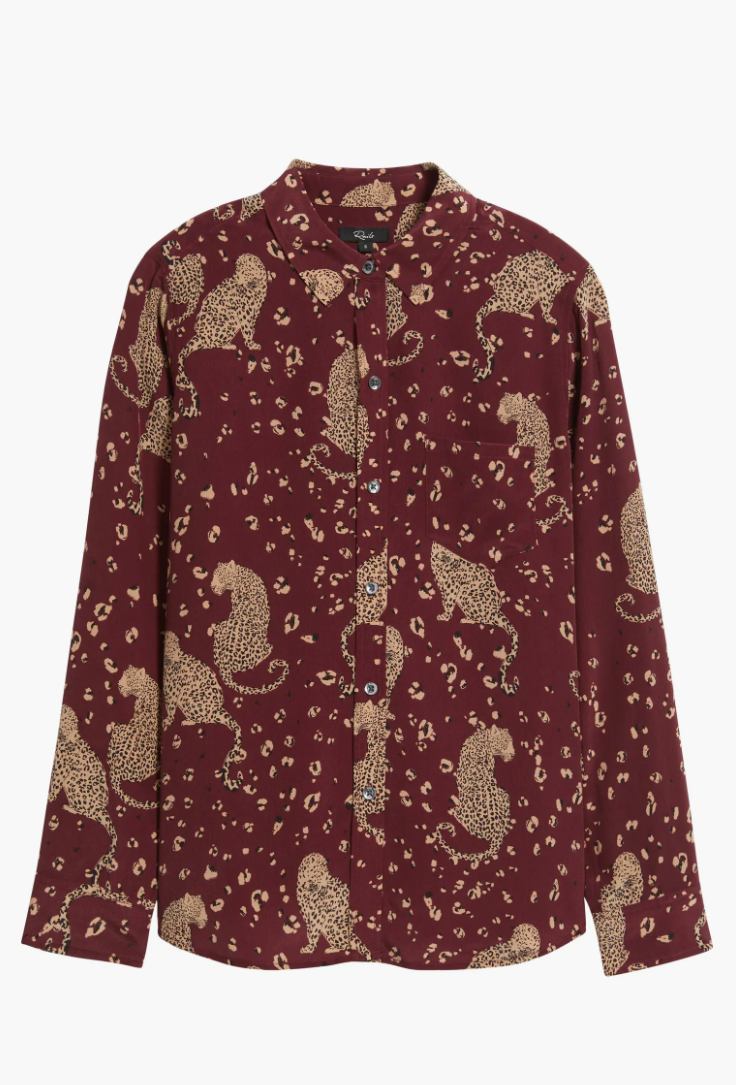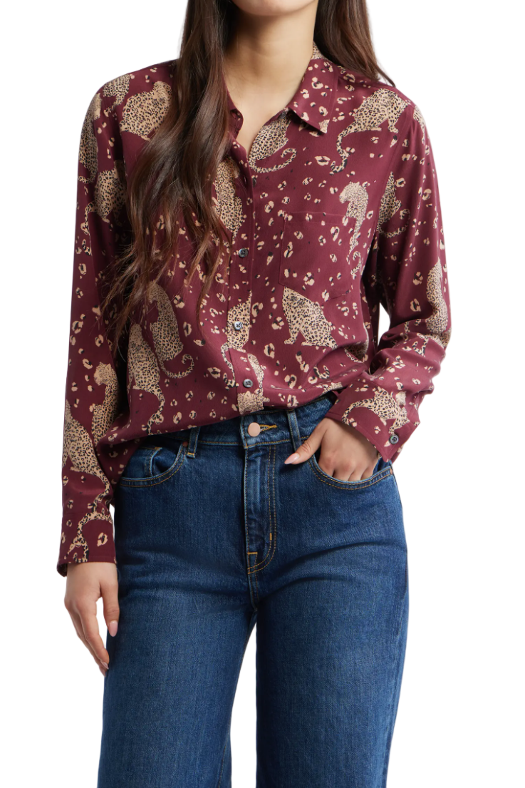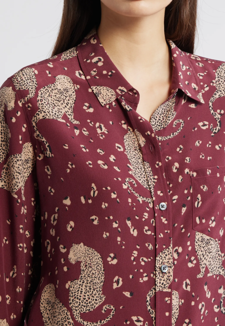 • A fierce jaguar print charms on this supple silk shirt that's a classic in every way and fashioned with a curved hem that you can tuck or wear loose