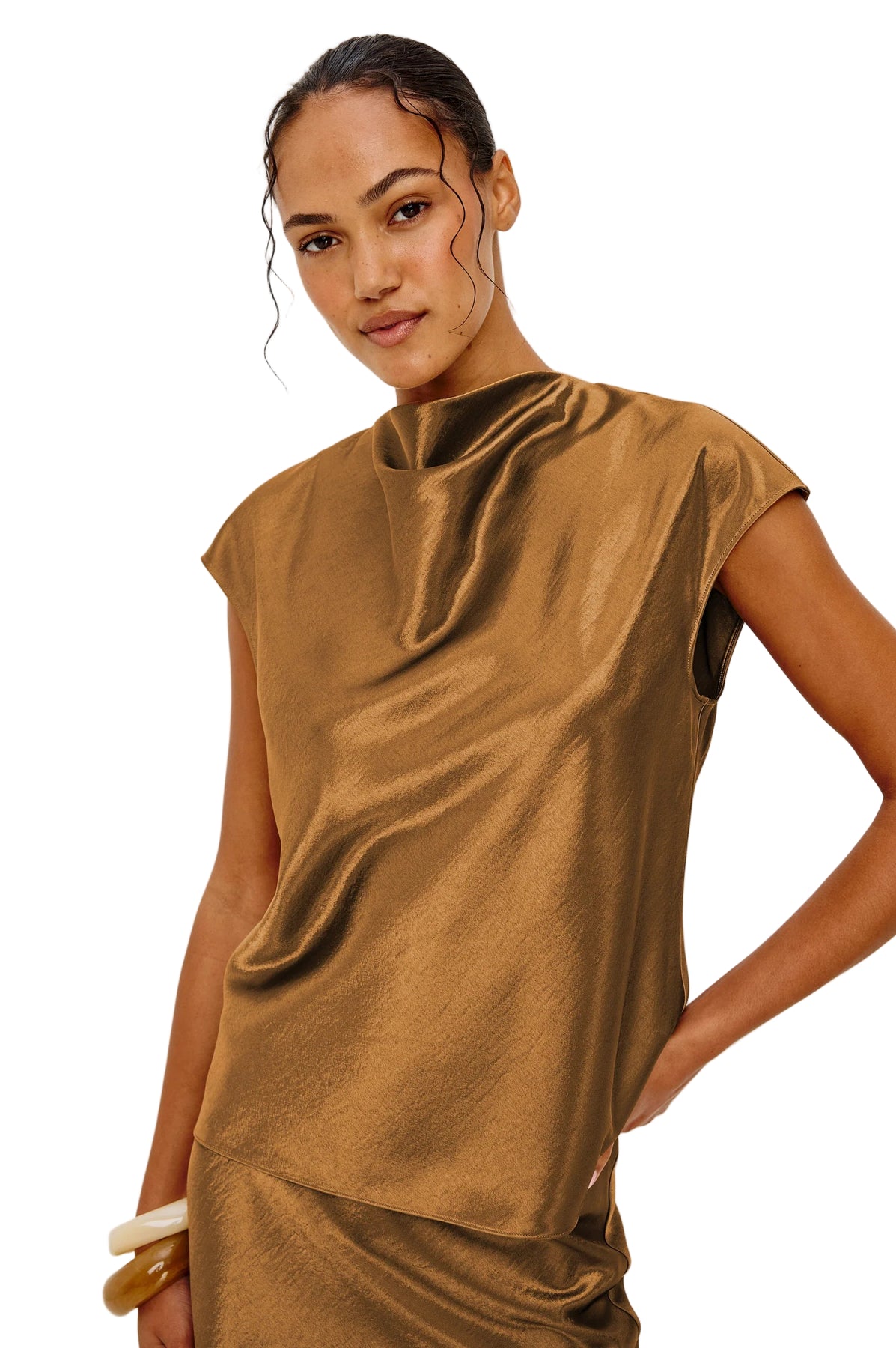 • This versatile top features a cowl neckline, cap sleeves, and a buttoned keyhole back cutout