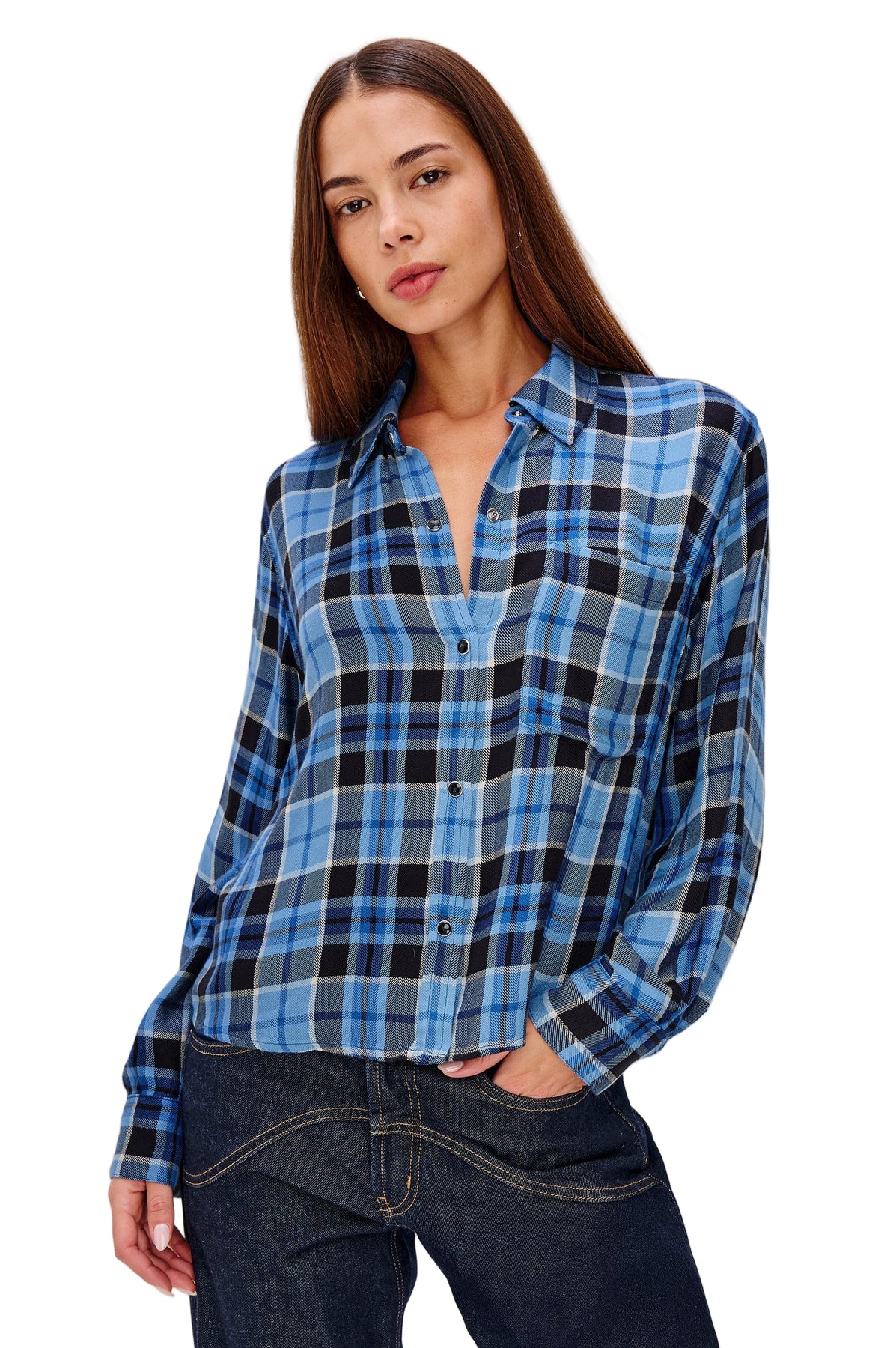 • This plaid button-down has the same timeless feel—now 5" shorter for a cropped, boxy fit