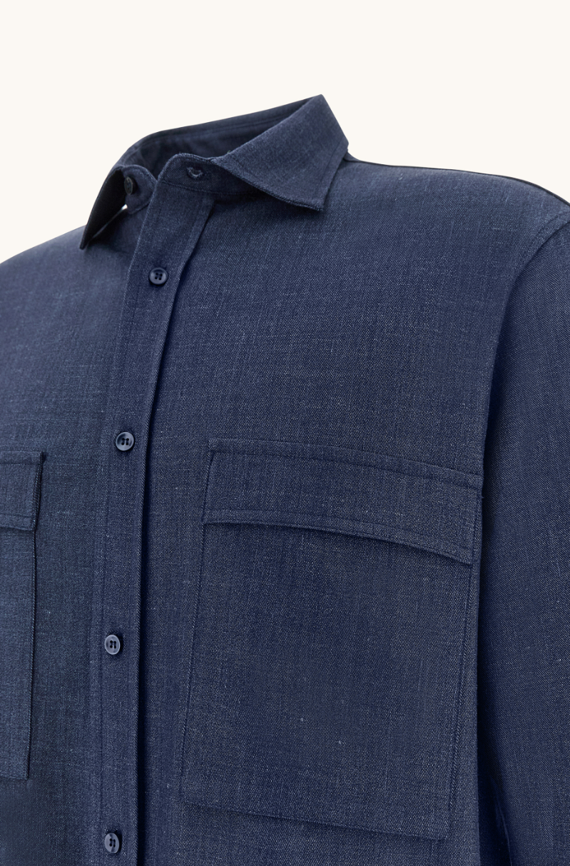 • The relaxed fit follows the body’s movements, while the French collar adds a note of sartorial precision