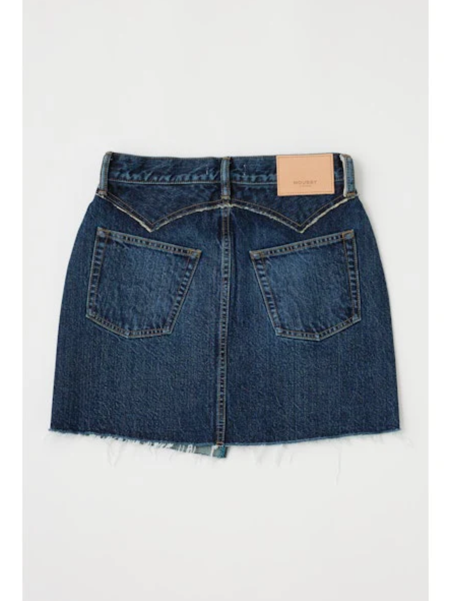 • This denim skirt is a forever classic with a contemporary touch, featuring an asymmetrical button detail, raw hem and a patch pocket on the back.