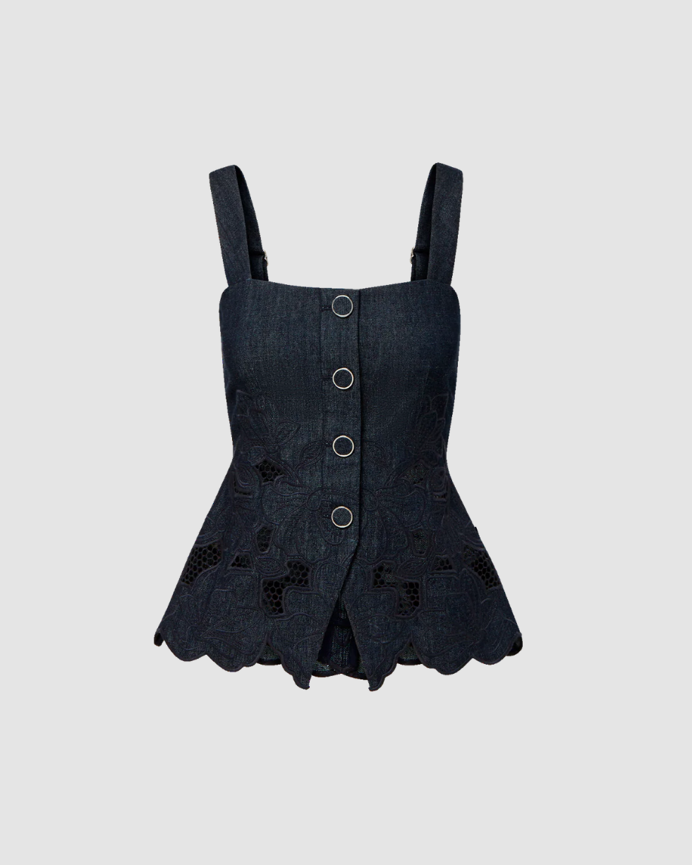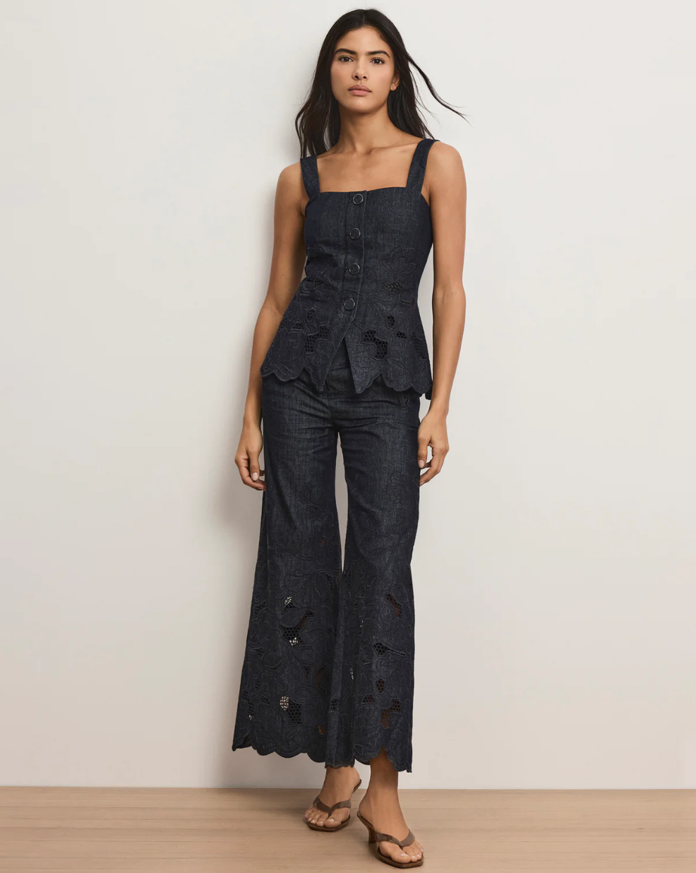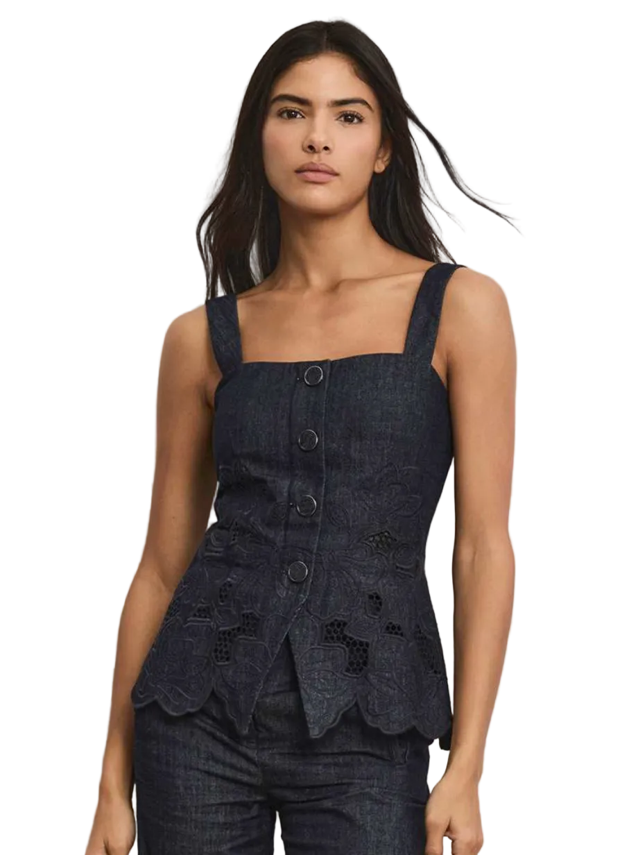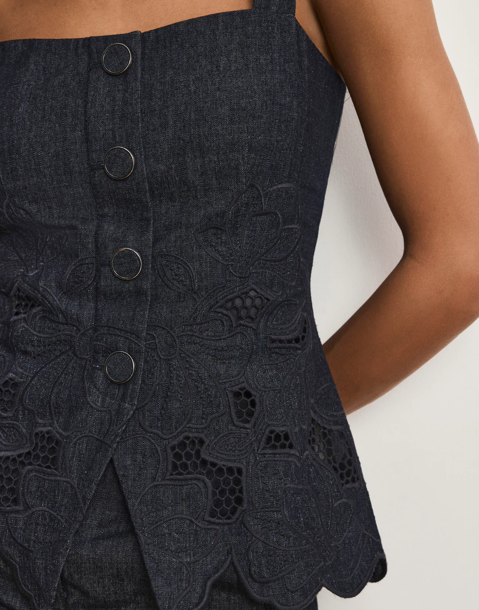 • Expertly tailored from premium cotton chambray, the Mirielle top features eyelet panels and a feminine petal-scalloped hem