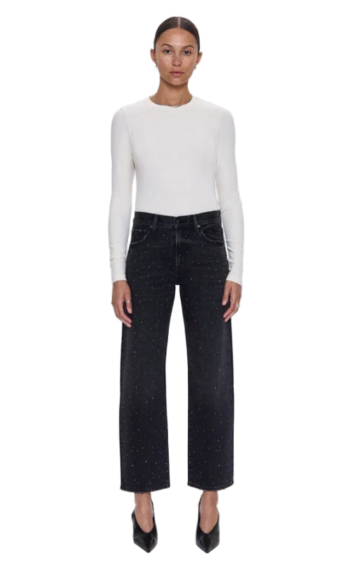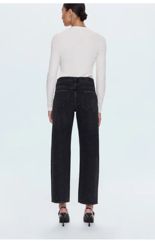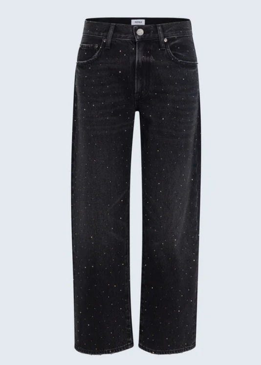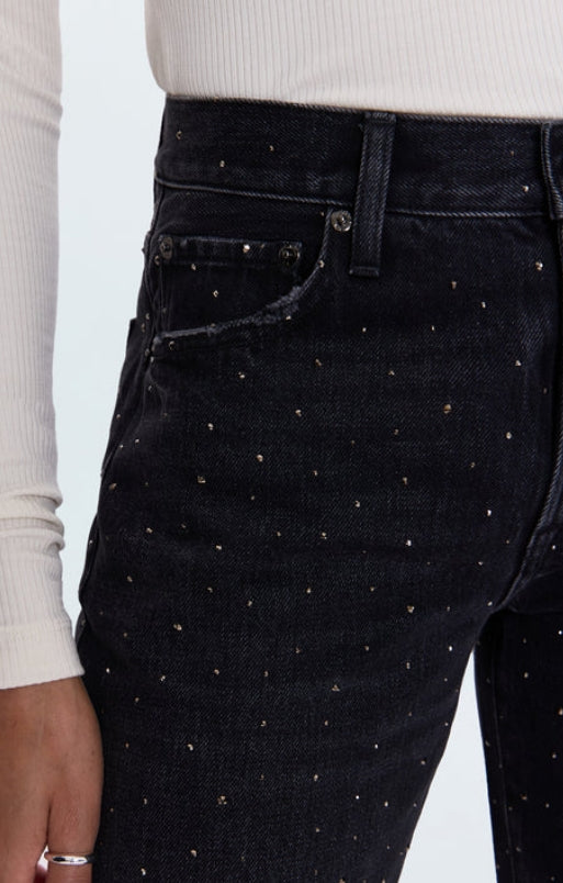 • Crafted from rigid denim in Silver Screen, a black wash adorned with micro rhinestones that catch the light for understated shimmer
