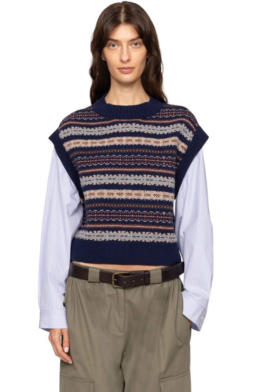 • The Ciara fair isle combo top combines a cozy knit bodice with ribbed detailing and crisp striped shirting sleeves